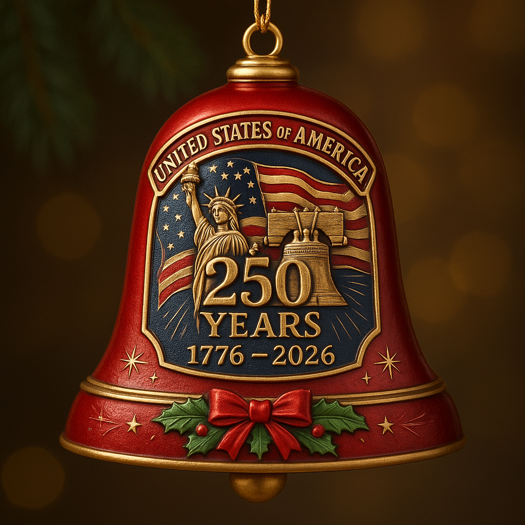 Celebrate America's history with the U.S. 250th Anniversary Bell Ornament. Crafted for lasting elegance, this keepsake blends patriotic spirit and artistry—perfect for marking a milestone and elevating your holiday décor.